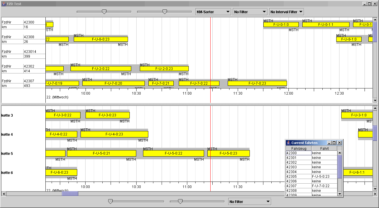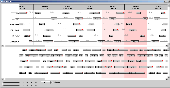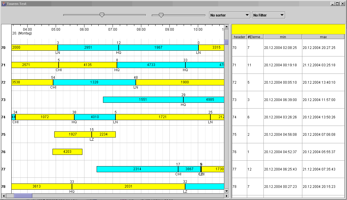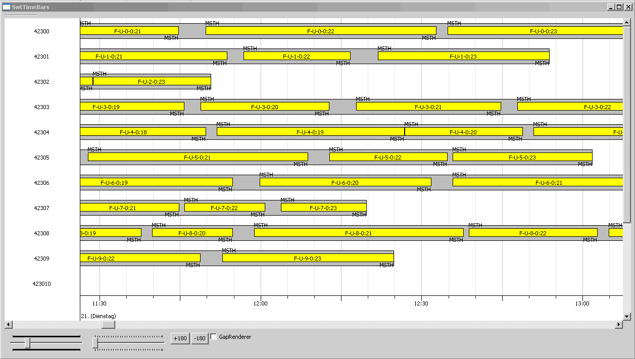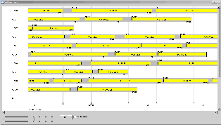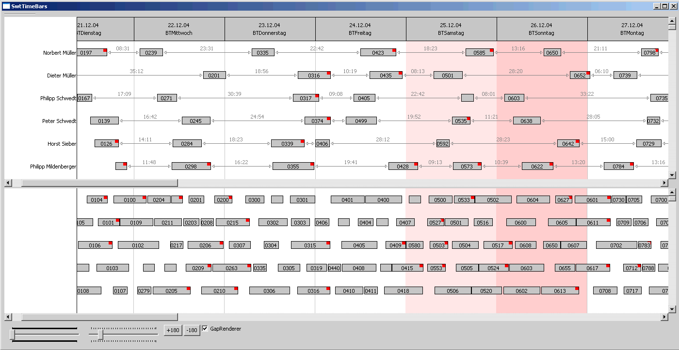 Swing: Simple view configuration showing (fake) duties. The TimeBarViewer is coupled with a JTable displaying details. (Default grid renderer, default header renderer, default time scale renderer)(v0.94)
